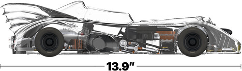 Measuring approximately 13.9” long and 5.6” wide, this Batmobile is a DC collector’s dream. Clear, injected translucent plastic covers the outside of the vehicle, and two of the panels are removable: the cockpit and the front.