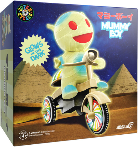 Inspired by the vintage-style plastic and tin wind-up tricycle toys, this whimsical 5”, Super7 Super Cycle features a soft vinyl glow-in-the-dark Mummy Boy in the driver’s seat, looking like he’s ready to cycle his way into your heart, day or night, featuring a glow bike with colorful wheels and a functioning bell above the back tire!