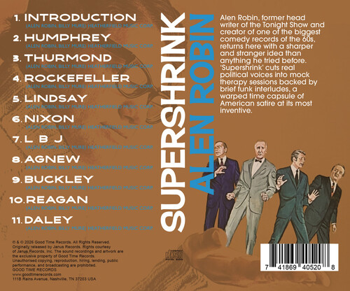 Alen Robin, former head writer of the Tonight Show and creator of one of the biggest comedy records of the 60s, returns here with a sharper and stranger idea than anything he tried before. 'Supershrink' cuts real political voices into mock therapy sessions backed by brief funk interludes, a warped time capsule of American satire at it's most inventive.