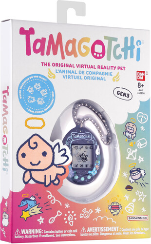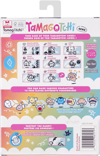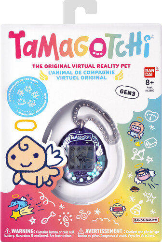 Comes with Angel programming, the device will begin with the Obaketchi Angel (a ghost character) and depending on how you nurture your character will determine which of the 5 adult Tamagotchi Angel characters you will get. You feed your character, clean up after it, and even praise it. Plus, you can play the Shooting Star mini game! Includes the CR2032 battery and attaches to your bag so it goes everywhere! Ages 8+