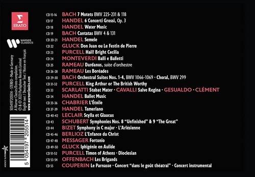 My love for baroque music has never been exclusive. Of course I am attracted by period instruments, but that has never been an end in itself. For me, it is simply a matter of always moving further towards the truth, towards a fresh interpretation." As idiomatic and revelatory in Bach, Handel, Purcell, Rameau and Campra as in Gluck, Berlioz, Offenbach, Chabrier and Massenet, Sir John Eliot Gardiner is a conductor whose passion and curiosity for music seem as inexhaustible as his enterprising spirit. This 64CD set unites his entire discography for Erato, EMI and Virgin, produced over a period of nearly 20 years. Many of the recordings cast new light on the repertoire, expanding Gardiner's influence and enhancing his reputation as the guiding force of the Monteverdi Choir and Orchestra, English Baroque Soloists, and Orchestre de l'Opéra de Lyon. As the Financial Times has written :.What Gardiner demonstrated... is that stylistic fidelity is a movable feast, and he has not lost his hunger for it."