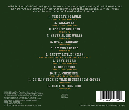 With this album, Curly's fiddle sings with the voice of the land, forged from long days in the fields and the hard rhythm of country life. These tunes carry the roots of bluegrass music's very soul - music shaped by labor, pride, and the soil in which it was born.