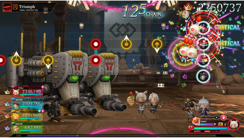 The music of FINAL FANTASY comes together here. A rhythm action game packed with carefully selected music tracks from across the whole FINAL FANTASY series. Includes popular tracks from a total of 46 different games, featuring the latest music from FFI through to FFXV in the main series, as well as remakes, spin-offs and various different soundtrack CDs. Relive the thrilling battles and soaring emotions alongside beautiful music and video. Throw yourself into the rhythm. Push the buttons in time with the music to match triggers moving across the screen on 3 different types of stage. With easy to learn controls and four different difficulty settings, anyone can jump in and have fun straight away. You can even grab a second controller to play together with a friend in the same room. Online multiplay for up to 4 players. Introducing riotous online Multi Battles where everyone plays together! Interfere with the other players plans and make clever use of your Burst abilities to turn the tables and grasp victory. Don't forget to exchange profile cards once the battle is over! Put together the party of your dreams with a total of 104 characters to choose from. Meet cute, chibi versions of many classic characters and monsters from the series as exciting RPG battles play out alongside the rhythm action. Gather and power up your team to beat the next stage. Enjoy the music and video at your leisure. The game also features music player and theatre modes that let you sit back and enjoy the tracks and movies you have collected without the rhythm game action.