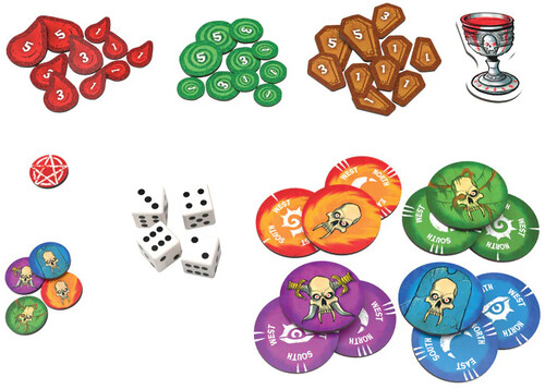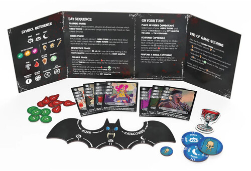 Components: Game Board, 4 Player Screens, 4 Player Boards, 36 Location cards, 36 Ritual Cards, 114 Victim Cards, 92 Blood Tokens, 91 Influence Tokens, 56 Victory Point Tokens, 1 Start Player Marker, 1 Day Marker, 4 Fear Tracking Tokens, 4 Dice, 12 Order Tokens, Rule Book