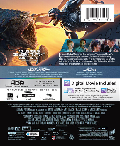 In Venom: The Last Dance, Tom Hardy returns as Venom, one of Marvel's greatest and most complex characters, for the final film in the trilogy. Eddie and Venom are on the run. Hunted by both of their worlds and with the net closing in, the duo are forced into a devastating decision that will bring the curtains down on Venom and Eddie's last dance. Venom: The Last Dance stars Tom Hardy, Chiwetel Ejiofor, Juno Temple, Rhys Ifans, Peggy Lu, Alanna Ubach and Stephen Graham. The film is directed by Kelly Marcel from a screenplay she wrote, based on a story by Hardy and Marcel. / Action/Adventure, Sci-Fi, Thriller. 2 DISCS / RUNTIME: 109 Minutes