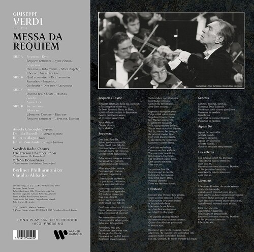 Claudio Abbado had only made a very few recordings for EMI Classics (now Warner), including Mozart's Flute Concertos with Emmanuel Pahud. This live rendition of Verdi's Messa da Requiem is definitively a major modern version of the work. In 2001, Abbado was doing his. In 2001, Claudio Abbado was soon to complete his tenure as Chief Conductor and Artistic Director of the Berliner Philharmoniker, when he was diagnosed with stomach cancer not long before. Nonetheless, he was able to conduct this Verdi Requiem during two concerts that held a special significance, offering us a remarkable modern interpretation of the work. It featured an outstanding quartet of soloists, three of the world's most renowned choirs, and Berlin's iconic orchestra. "EMI was quite right to be on hand to record this performance in Berlin at a time when Abbado had arisen from his sick-bed to show just how much this work meant to him in the circumstances. It's conveyed in spades through the tremendous concentration and emotional thrust felt throughout this shattering interpretation. This performance has something extra that you find in Fricsay's live, 1960 account, and both come close to the spiritual element in the music. Abbado has at his bidding a superb group of specialist choirs who combine effortlessly into a cohesive whole, singing with commendable breadth, accuracy and involvement, few if any better on disc. They find fit counterparts in the players of the BPO who seem individually, in solos, and collectively intent on giving of their appreciable best for their chief. So all the big choral moments, Dies Irae, Rex tremendae, Sanctus, Libera me fugue are superbly achieved. EMI's recording is wide-ranging and immediate, the equal of any the work has yet received. If the solo singing can't be given such an unqualified encomium, much of it is impressive, especially that of the young mezzo Daniela Barcellona, even in tone and beseeching in manner. Gheorghiu does so much so well: she sings throughout in that rich, warm tone of hers and offers many long, arching phrases. She's also as dramatic as one could wish in the Libera me (...). Alagna sings with a deal of passion and authority. (...) Given it's superlative sound and special circumstances, [it] is an important addition to the work's discography." The Gramophone Classical Music Guide