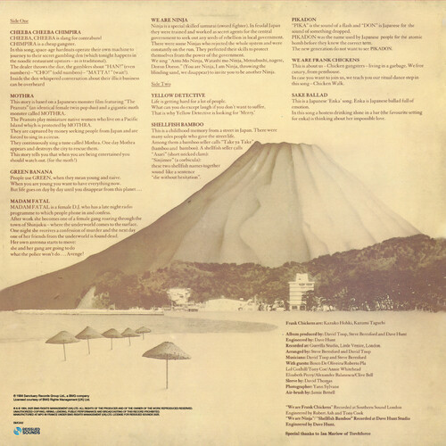 We Are Frank Chickens by Frank Chickens is back on vinyl-a bold, eccentric, and genre-defying debut that first hit the scene in 1984. Blending post-punk, synth-pop, performance art, and satirical wit, this cult classic introduced the world to the unique voice of Japanese-British duo Kazuko Hohki and Kazumi Taguchi. With it's minimalist arrangements, offbeat humor, and subversive edge, the album stands as a vibrant artifact of alternative music in the '80s. From the quirky anthem "We Are Ninja (Not Geisha)" to the surreal spoken-word rhythm of "Shellfish Bamboo," Frank Chickens deliver playful but pointed commentary on identity, culture, and stereotypes. Their songs are as much performance pieces as they are tracks-layered with irony, spoken vocals, and electronic textures. It's outsider pop with purpose, brimming with creativity and fearless originality. This long-overdue vinyl reissue restores a landmark in avant-garde pop history. We Are Frank Chickens remains a must-have for collectors of post-punk oddities, feminist art, and trailblazing underground music. Unapologetically strange and refreshingly smart, the album still sounds ahead of it's time.