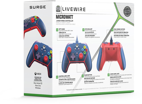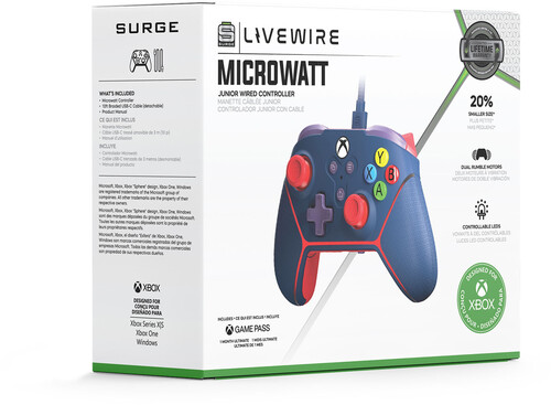 The Livewire Microwatt Controller offers full sized functionality in a 20% smaller size. Designed for younger gamers, the custom grip texture on the handles, triggers, and thumbsticks keeps you on target. The LED light bar and thumbstick underglow highlight your skills and can be adjusted to match your style. Dual rumble motors enhance your experience, and a 3.5mm audio port makes it easy to chat with friends. Equipped with a detachable 10-foot braided cable, the Microwatt is the perfect travel buddy, providing full functionality in a compact size.
