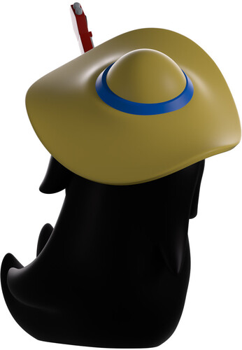 Wearing a red sleeveless top along with blue jeans and knee-high brown boots that have bows running along the back, a floppy wide-brimmed hat rests atop her head with a blue line around the center. The exterior of her packaging sees her floating in front of a stone door covered in faces. While the interior is covered in a light blue and white sky which makes its way onto the protective sleeve above a rolling green field as her figure can be seen through the large clear window at the packaging’s front.