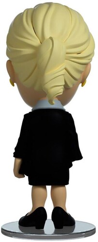 Sculpted at 4.7 inches high, Kim Wexler is seen with a confident yet inquisitive look on her face. Her hair is styled in a low pulled back ponytail and she is accessorized with gold earrings on both ears. She is dressed in a black dress that falls to her knees that is complimented with a black blazer jacket on top. Her left hand is resting beside her while her right arm is across her chest in a white cast.