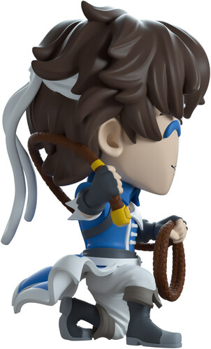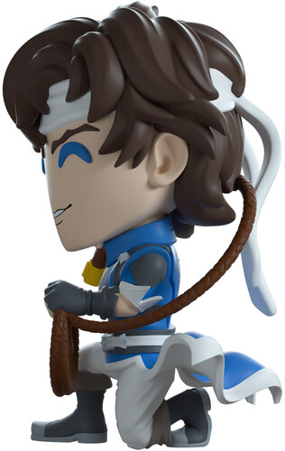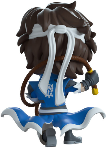 Richter is posed crouching at 4.2 inches on his left knee and holding a long brown whip which wraps around his body. He holds the curled end in a clenched gloved fist, strands of messy brown hair fall over the white bandana that’s tied around his forehead and falls down his back. With a determined grin crossing his face, his long blue coat flows out at the waist and is embellished with a thick white trim as his pale pants lead into tall grey boots.