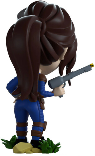 Leaning to the side at 4.6 inches tall with a pink lipped smile curling across her face as her long brown hair falls down either side to frame it perfectly, the rest is pulled into a thick ponytail which falls down her back. Holding a long barreled pistol in her right hand and wearing a full body blue and yellow vault jumpsuit which is covered in brown straps and padded armor, her trusty grey Pip-Boy sits on her left wrist.