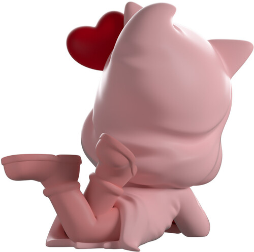 Swooning at 3.3 inches tall and laying on his stomach with legs kicking playfully as he's dressed in light pink robes, he props up his iconic mask with one hand while holding onto a red knife with the other as a red heart floats at the top of his head next to short pointed ears. The exterior of his packaging has been illustrated with blood trickling down a pink wall to form a perfect heart, while the interior and protective sleeve have been designed with bright pink scratches over a red background as his fi