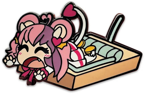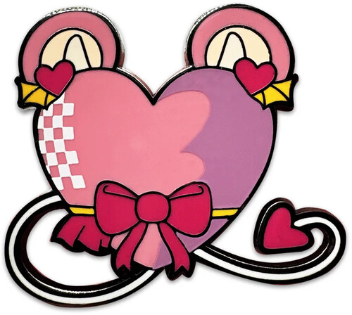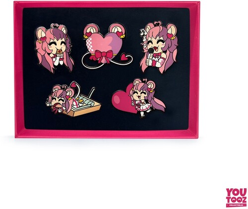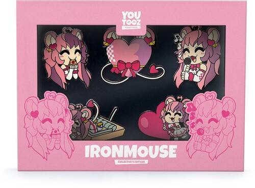 The collector's box contains 5 enamel pins. The pins vary in size but are all around 2 inches tall or wide with a shiny and high-quality finish. The box comes with Iron Mouse getting caught in a mouse trap, a purple and pink heart, Iron Mouse singing, Iron Mouse eating pizza, and Iron Mouse hugging a giant heart!
