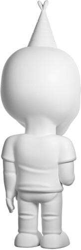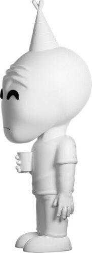 Ripped out of the internet and into the palm of your hand, he is pure white, wearing a party hat and holding a cup, with a somber expression on his face.