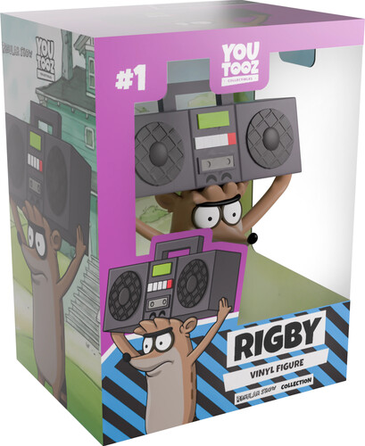 The exterior of his packaging has been illustrated with Rigby holding the boom box, while the interior is designed with an aerial shot at the iconic park they work at. The protective sleeve then sees a jagged purple and striped blue pattern over a cosmic background as his figure can see seen through the large clear window at its front.