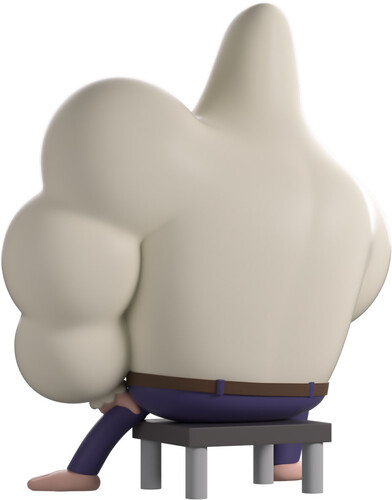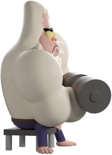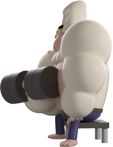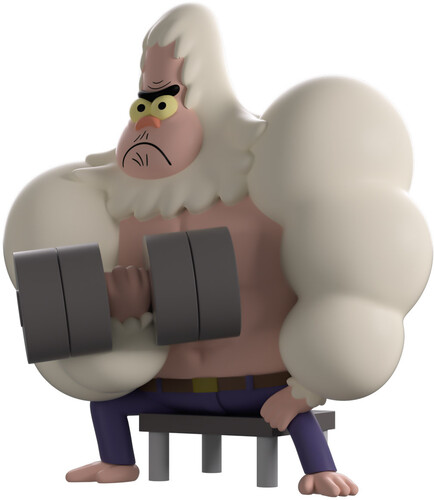 Sitting at 4.1 inches tall and leaning to the side as he performs a bicep curl in perfect form with a look of intense concentration (or frustration) crossing his face, white fur juts out from his chin and covers his huge muscular arms leaving his chiseled chest bare as he wears nothing but purple jeans.