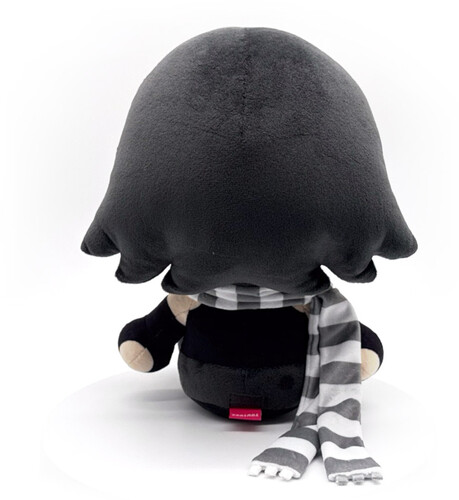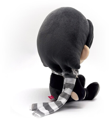 Sitting at 9 inches tall with round black eyes and a thick red fringe that falls over her face, her black bob sweeps out above her shoulders as a grey and white striped scarf wraps around her neck. Wearing black gloves that match her tight singlet top, dark grey pants lead down to her shoes which have a light tread.