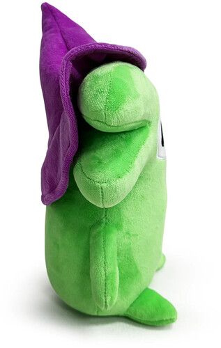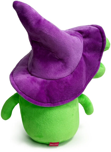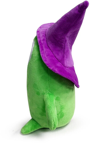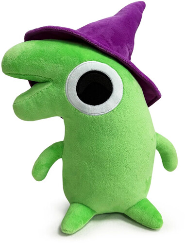 Sitting at 9 inches tall with a huge round eye and a massive green mouth that opens up to the side of his head, he wears nothing but a pointed purple wizard hat as thin limbs stick out from his narrow body.