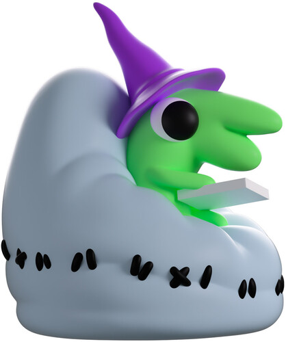 Are you ready for Glep’s Youtooz debut?! Glep? Glep!! Pay attention to us! Sitting snuggly in an old patched up grey beanbag that has a line of black stitching running around the center to keep its soft filling inside, Glep stares down with huge, round eyes, fully engrossed in the white tablet held in his green hands as a pointed purple wizard hat rests atop his head.