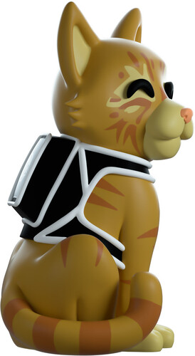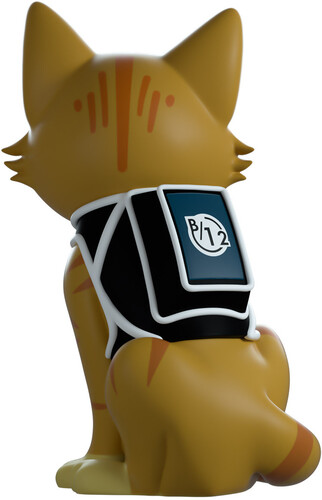 This cute orange tabby sits 4.6 inches tall. They are sitting gleefully on their bum, as their tail wraps around to the front of its body. Speckled across their body are stripes in varying tones of orange. This stray is complete with a black backpack, with white pipping and on the top a blue square with the B 12 logo.